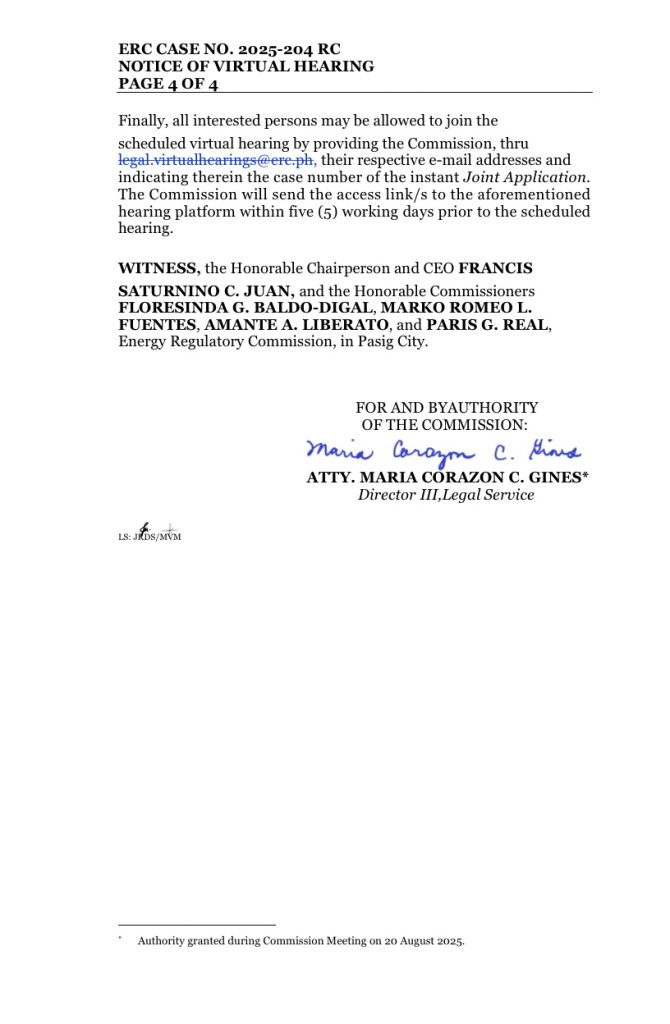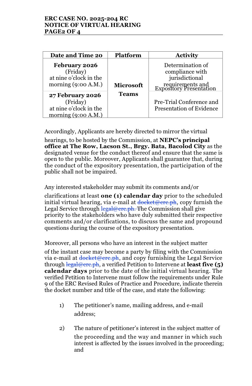 Request for Link: Any interested party who wishes to participate may request a link from the ERC Legal Service via legal.virtualhearings@erc.ph at least five (5) days prior to the hearing.
