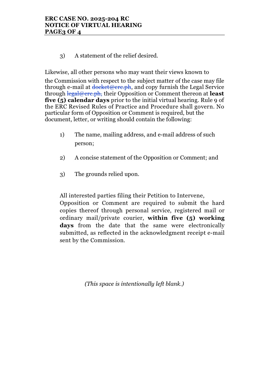 Formal Comments: Comments on the application may be submitted to the ERC Docket Division at docket@erc.ph at least one (1) calendar day before the initial hearing.