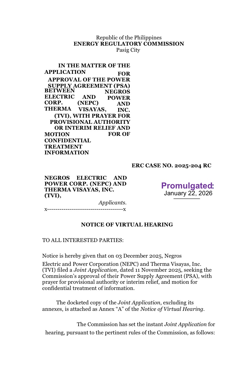 Negros Electric and Power Corp. (NEPC) and Therma Visayas, Inc. (TVI) hereby inform the general public of the filing of their Joint Application for the Approval of the Power Supply Agreement (PSA) before the Energy Regulatory Commission (ERC).